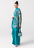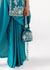 Siyra is a ritual of reinvention where tradition collides with couture. A pant-saree draped in luminous turquoise green satin cascades in sculptural folds, creating movement that is both commanding and effortless. The open-front jacket, detailed with silver botanical embroidery and crystal accents, frames the silhouette with regal precision, while the matching embellished potli completes the ensemble with ceremonial intent.